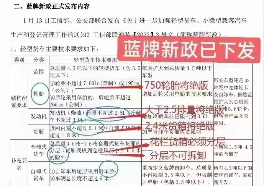 2022年藍牌專用汽車車輛上牌新規定解讀大噸小標不可取。工業和信息化部 公安部關于進一步加強輕型貨車、小微型載客汽車生產和登記管理工作的通知:近年來,輕型貨車“大噸小標”、小微型載客汽車違法載人載貨引發的道路交通事故多發,給人民群眾生命財產安全造成重大損失,成為嚴重道路交通安全隱患。為貫徹落實《全國安全生產專項整治三年行動計劃》和《道路運輸安全專項整治三年行動實施方案》要求,切實加強車輛生產和登記管理,進一步提高輕型貨車、小微型載客汽車安全技術性能,現將有關事項通知如下: 一、提高輕型貨車、小微型載客汽車安全技術要求 (一)為從產品源頭有效消除輕型貨車“大噸小標”、超載運輸隱患,遏制小微型載客汽車非法改裝行為,自本通知發布之日起,新申報《道路機動車輛生產企業及產品公告》(以下簡稱《公告》)的輕型貨車產品應當增加貨廂材質、厚度、重量等參數信息,小微型載客汽車產品應當增加座椅布置、固定方式等參數信息。新申報產品及已列入《公告》的在產產品,除需符合國家有關政策和強制性標準要求外,還需滿足本通知附件《輕型貨車、小微型載客汽車安全技術規范》(以下簡稱《技術規范》)規定要求。不符合本通知《技術規范》要求的新產品,工業和信息化部將不予公告。 (二)不符合本通知《技術規范》要求的在產產品,2022年3月1日起,生產企業應立即停止生產,相關機構應立即停止接收相關產品合格證信息;其中,對已列入《公告》的排量大于2.5升但符合本通知其他要求的輕型貨車在產產品,給予生產銷售過渡期6個月,過渡期滿后,生產企業應立即停止生產,相關機構應立即停止接收相關產品合格證信息。 (三)對2022年3月1日前已生產并已上傳合格證、但不符合本通知《技術規范》要求的庫存產品,生產企業可向工業和信息化部提出庫存延期銷售申請,并隨附庫存清單以及生產企業關于該型產品無“大噸小標”等違規情況、自愿承擔相關法律責任的書面材料,經履行核實、公示等相關程序,可給予6個月延期銷售、注冊登記期限。根據道路運輸安全專項整治行動進展的具體情況,工業和信息化部、公安部將適時修訂完善《技術規范》。 二、落實生產企業產品安全質量、生產一致性主體責任 (四)生產企業應當提高安全責任和風險防控意識,嚴格落實產品安全質量、生產一致性主體責任,合法守信進行生產經營,健全相關管理制度,加強車輛產品出廠前安全質量檢驗,確保批產產品符合國家強制性標準和有關規定要求,確保批產產品與公告型式批準車型規格參數一致,切實提高車輛產品安全性能。 (五)采用委改方式生產的貨車整車生產企業承擔委改產品安全質量、生產一致性完全責任,要制定辦法對委改企業加強管理,對委托改裝車輛產品實施質量控制和生產一致性管理,保證委改產品參數與許可參數一致。 (六)生產企業應加強對機動車整車出廠合格證管理,在機動車制造完畢且檢驗合格后實時填報、傳送合格證電子信息,合格證載明的信息應當與《公告》產品技術參數以及產品實際技術參數一致,不得銷售尚未傳送合格證電子信息的機動車,嚴禁上傳未生產下線機動車整車合格證電子信息。嚴禁為同一機動車配發不同《公告》型號的機動車整車出廠合格證,嚴禁對檢驗不合格、不符合生產一致性要求的車輛出具整車出廠合格證明。對不符合本通知要求的已公告產品,生產企業應組織進行設計整改,經整改確認符合要求的,可恢復其產品生產及合格證傳送。 三、嚴把車輛產品檢驗機構產品檢測關 (七)承擔《公告》車輛產品檢測工作的車輛檢驗機構要嚴把產品檢測關,在對申報《公告》的樣車進行檢驗時,嚴格按照國家標準和有關規定進行,不得減少檢驗項目,不得降低檢驗標準,并嚴格執行檢驗樣品保留3個月的樣品追溯制度。 (八)檢驗機構要嚴格貨車產品空載檢測,重點檢測貨車產品整備質量,保證在車輛隨車工具、備胎、水箱、油箱按規定配備、加注的條件下進行測量,嚴格核驗車輛發動機、輪胎、車橋、鋼板彈簧等配置與申報車型總質量是否匹配,檢驗過程視頻應當留存不少于6年;對涉及滿載檢測的,要在檢測報告中說明載荷加裝方式方法,并附載荷加裝照片,保存相關視頻,其中,采用大型砝碼等模擬載荷進行滿載檢測的,還應評價車廂(車斗)強度與車輛申報承載能力是否匹配。發現車型配置、載貨空間與總質量不匹配、不合理,或存在生產企業制作使用“值班車廂(車斗)”送檢的車型,檢驗機構應及時停止檢驗并向主管部門報告。要嚴格小微型載客汽車靜態檢驗,重點檢查車輛座椅布置及車廂后部空間是否符合本通知規定。對不按上述要求進行產品檢驗、造成嚴重檢測質量事故的檢驗機構,工業和信息化部將暫停采信其檢驗報告,并通報有關部門依法依規處理。 四、強化車輛產品生產一致性監管 (九)工業和信息化部將會同地方主管部門重點圍繞輕型貨車、小微型載客汽車生產企業及產品,以問題為導向,以重點檢查與“雙隨機”相結合的方式,開展生產一致性監督檢查。各級工業和信息化主管部門要加強對車輛生產企業的生產一致性監管,督促車輛生產企業提高輕型貨車、小微型載客汽車等產品安全技術水平。 (十)工業和信息化部門和公安交通管理部門要加強協作配合,進一步完