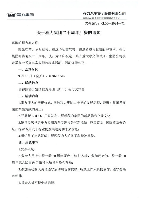 關于程力集團二十周年廠慶的通知 尊敬的程力家人們: 時光荏苒,歲月如梭。在這個秋高氣爽,充滿希望與收獲的季節里,程力集團即將迎來二十周年廠慶,為了慶祝這一具有重大意義的時刻,集團公司決定舉辦一系列豐富多彩的慶典活動,活動詳情如下: 一、活動時間 9月15日(全天),8:30-23:58。 二、活動地點 曾都經濟開發區程力集團(新廠)程力大舞臺 ![]() 三、活動內容 1.舉辦盛大的慶祝儀式,回顧程力集團二十年的發展歷程,表彰為集團發展做出突出貢獻的員工; 2.開展新LOGO、廠歌發布,展示程力集團的新品牌和企業文化; 3.邀請專家學者舉辦專用汽車專題報告和新能源、應急裝備、國際貿易分論壇,探討專用汽車行業的發展趨勢和未來前景; 4.組織員工文藝匯演,展現程力人的風采和精神風貌。 四、注意事項 1.憑票入場; 2.參會人員上午統一著20周年藍色T恤衫入場,參加晚會的,統一著20 周年紀念版白色T恤衫入場參與晚會互動; 3.參加活動的人員請遵守活動現場的秩序,聽從工作人員的安排,遵守會場的紀律; 4.參會人員不得中途退場; 5.請大家在活動期間注意安全,確保人身和財產安全; 6.請各子公司、各部門提前做好活動準備工作,確;顒禹樌M行; 二十年風雨兼程,二十載春華秋實,程力集團的二十年,是拼搏奮進的二十年,是開拓創新的二十年,以二十周年廠慶為新的起點,鄭重邀請各位程力家人們出席公司“20周年慶”活動,共同分享程力集團的美好時刻,為實現程力集團愿景目標而努力奮斗! 特此通知。 ![]() ![]() |