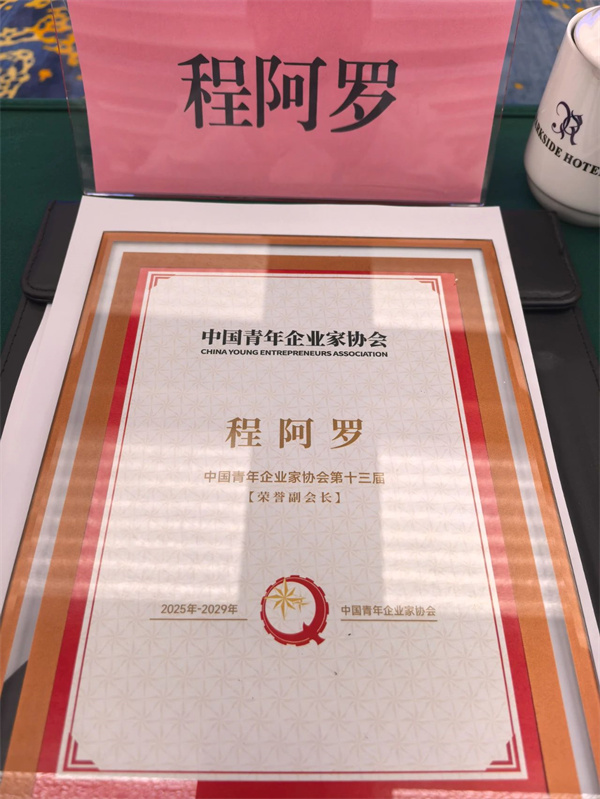 上圖:中國青年企業家協會授予程阿羅董事長“中國青年企業家協會第十三屆榮譽副會長”證書。