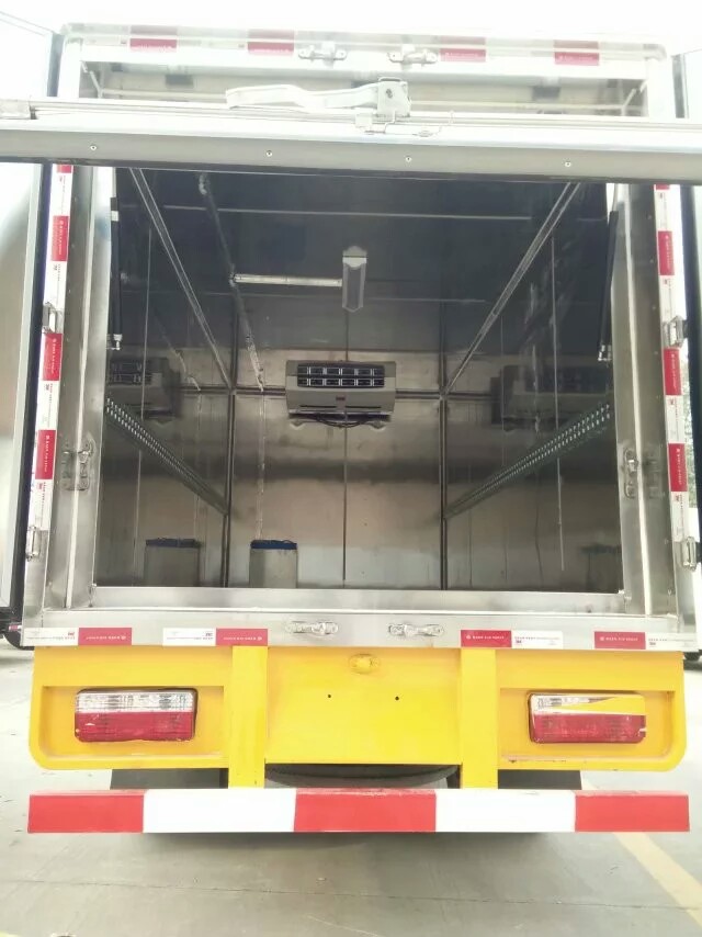 湖北程力東風多利卡醫療廢物轉運車: 配備東風多利卡經典1730駕駛室,朝柴100馬力,2噸前橋,3.5噸后橋,萬里揚5檔變速箱,700鋼絲胎,氣剎,動轉,ABS。車廂為密閉式結構,內腔材料為不銹鋼板,防銹、防水耐腐蝕、易清洗和。車廂內部裝有低溫殺毒,紫外線殺毒,噴霧殺毒設備,可隨時對車廂內部進行。廂體兩側設有桶固定裝置,保證車輛緊急啟動、停車或事故時廢棄物收集桶不會和翻轉。 湖北程力福田奧鈴醫療廢物轉運車: