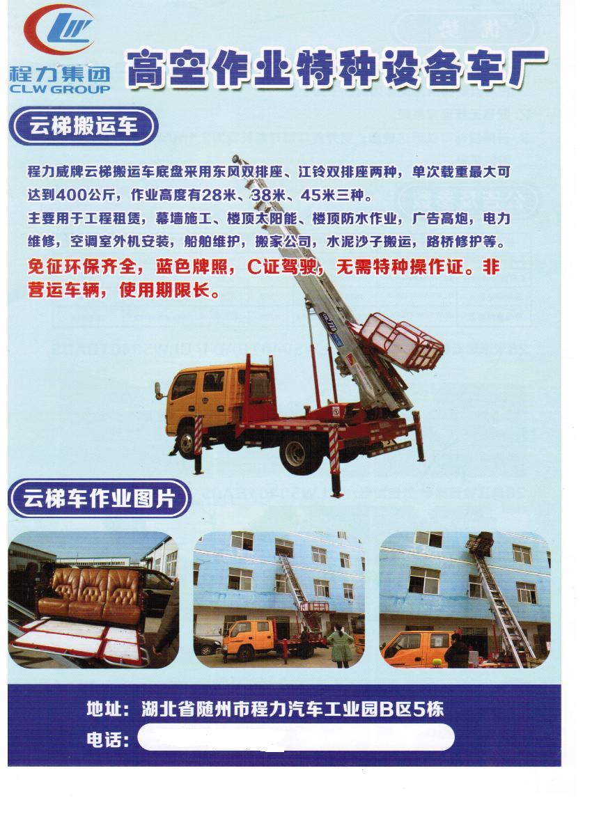 導讀:你還在為搬家樓層高、爬樓梯發愁嗎?湖北程力為你推薦一款云梯式搬家車.云梯車主要是隨著城市高層建筑的發展而發展起來的,其在現代城市發揮著越來越重要的作用!