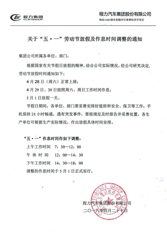 湖北程力汽車(chē)集團(tuán)5.1勞動(dòng)節(jié)放假通知