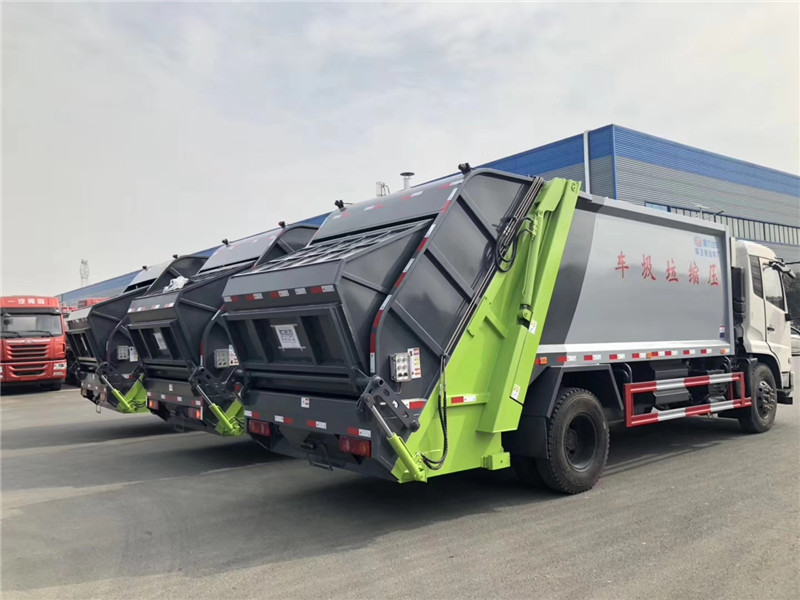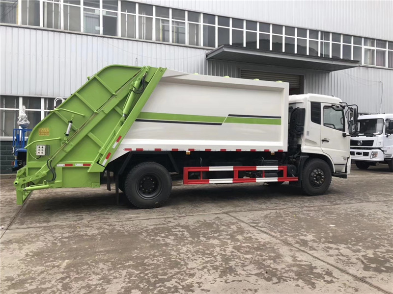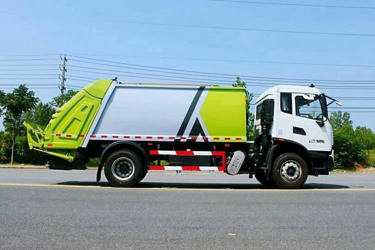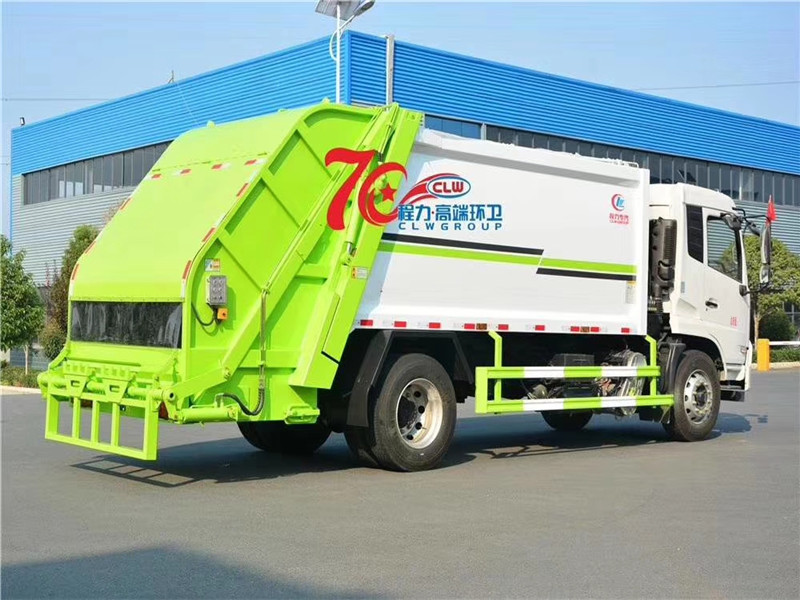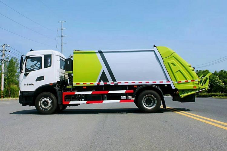 專用部分主要技術特點及產品描述: 1.垃圾箱:采用加強梁和鋼板焊接而成牢固的框架結構,實際容積最大為12-14立方,外形美觀,重量輕, 受力好,不變形;推鏟由鋼管骨架和折面板構成,不僅結構輕巧,又能使垃圾均勻分布,卸料干凈徹底;填裝器主要由填裝器殼體、滑板、刮板等構件組成,各構件采用受力良好的梁板或箱型結構,結構牢固,重量輕;為了提高使用壽命,對箱體進行了磷化防銹處理,并噴涂防銹底漆。2.液壓系統:利用電控和液壓控制的優點,通過控制轉換,保證了各機構動作準確可靠,提高了使用可靠性和效率;采用了先進的液壓舉升安全回路。其原理是在液壓系統中的舉升油缸上設置了單向平衡閥。該閥隔斷了舉升油缸與液壓膠管的直接連接,即使油管爆裂,填裝器也不會突然落下造成惡性事故,提高了使用安全性。3.裝卸方式:箱體尾部翻轉架帶翻桶(斗)機構裝卸,不會對操作人員造成污染。4.垃圾箱與填裝器之間采用特制橡膠條密封,密封性好,杜絕了二次污染。 湖北程力汽車國六東風天錦12-14方壓縮垃圾車多方位圖片展示: