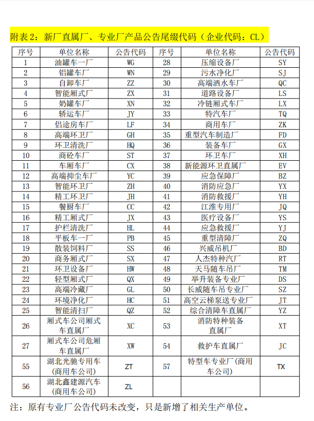 程力汽車集團(tuán)股份有限公司前身是湖北程力專用汽車有限公司,于2004年9月注冊(cè)成立,注冊(cè)資本10000萬元,主要從事汽車整車、專用汽車、新能源汽車、汽車零部件和應(yīng)急裝備等研發(fā)、制造、銷售,以及金融、教育、服務(wù)、置業(yè)投資等業(yè)務(wù),連續(xù)多年榮膺中國民營企業(yè)500強(qiáng)、湖北省民營企業(yè)制造業(yè)100強(qiáng)。 湖北程力新廠直屬廠、專業(yè)廠產(chǎn)品公告尾綴代碼(企業(yè)代碼:CL)
