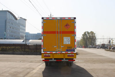 運輸品名:炸藥,雷管,煙花爆竹等,類項號:1.1B,1.1D,1.1G,1.2G,1.3G,1.4G 等。廂體頂部封閉不可開啟,側、后防護裝置材料材質為Q235A碳鋼,側防護與箱體底部焊接連接,后防護裝置與車架采用焊接連接,后防護截面尺寸(mm):100×50,離地高度為450mm。該車隨底盤選裝駕駛室,選裝側面開門。僅選用發動機型號: ISB3.9-125E40A、YC4E140-42對應的油耗值分別為(L/100km): 18.83、19.39。安裝前輪盤式制動器,安裝子午線輪胎和帶ABS的底盤。安裝帶有衛星定位功能的行駛記錄儀。ABS系統生產廠家/型號:東風電子科技股份有限公司汽車制動系統公司/36BG13-30010。 |