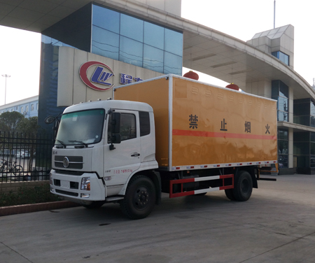 湖北程力專用汽車股份有限公司生產的爆破器材運輸車 廂體:為雙層金屬骨架結構,外部為冷扎鋼板,內壁采用鋁合金板蒙面,夾層為隔熱阻燃材料填充。設置對開門,如需安裝抗暴容器則增開側門,側壁設有防雨功能自然通風窗口,底部鋪有阻燃導靜電膠板,保證安全。廂體內部前面和側面裝有固定拉環,與捆綁帶使用捆綁貨物以避免移動。
