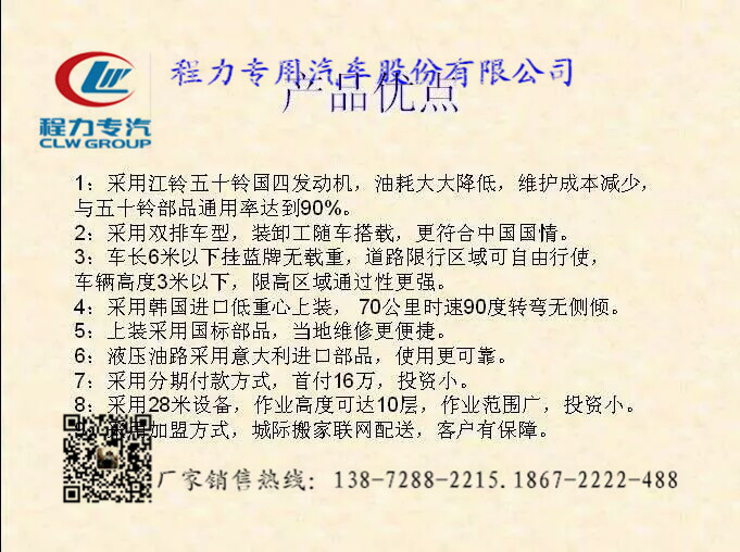 程力公司程力威牌云梯搬家車作業(yè)高度可達28米,相當于10層樓高,云梯車的承載貨物重量每次可達300公斤,藍色牌照,C證駕駛室,無需特種操作證。非營運車輛,使用期限30年。云梯從韓國進口,底盤有東風雙排座和江鈴雙排座兩種供用戶選購。廠家銷售熱線:0722-3220988.0722-7029866 |