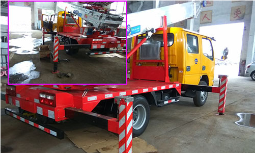 后車板安裝四條H型支腿,通過操作桿液壓控制,可同時自動伸縮。液壓支腿先水平向外伸展然后再垂向下展開,兩邊完全伸展開大約五米左右。液壓支腿控制整個車的平衡,碳鋼材質制成結實耐用。