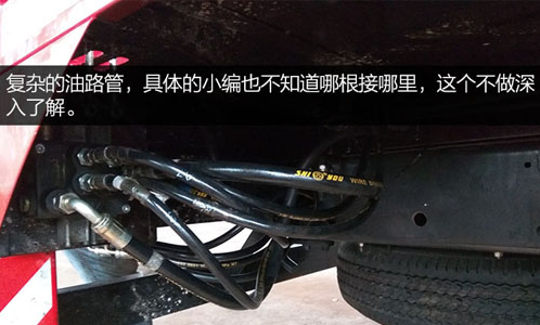 圖中上面部分為散熱器也可以稱為汽車空調,下面紅色鐵廂里面裝的是液壓油。散熱器主要給上裝所有油路管散熱,防止油管加快老化。液壓油廂里的液壓油供給上裝部分所有液壓操作部分使用。