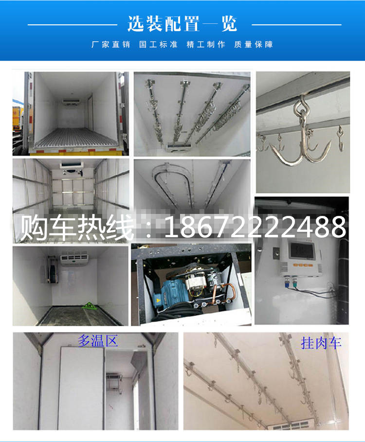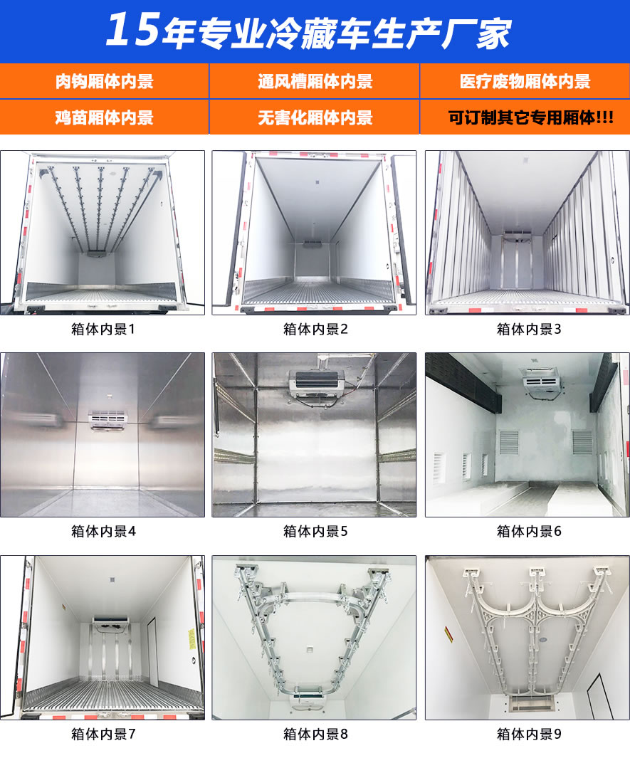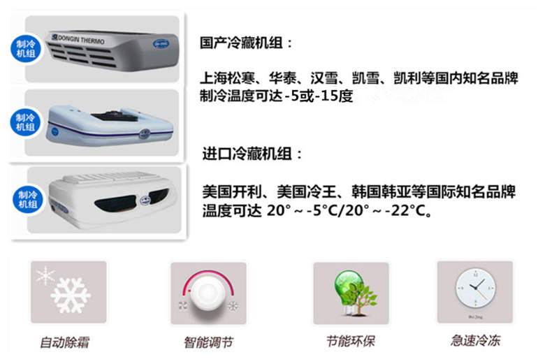 箱體采用三明治結構,內外采用冷藏車專用玻璃鋼(可反射陽光可選用不銹鋼),中間保溫層采用聚氨酯發泡隔熱材料,18米罐注一次成型,產品重量輕,漏熱率(導熱系數)低,強度高,保溫效果好,廂體美觀大方扎實耐用。廂體厚度8CM.廂體全為不銹鋼鎖件,鋁合金包角,廂體可選裝通風槽、開側門等。根據需要可選裝配國內外知名制冷機組(溫度達到保鮮或冷凍要求),可根據您的需求進行定制生產。
